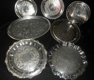 Silver plated serving pieces varying in sizes and prices. Can be rented tarnished or polished.